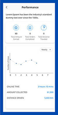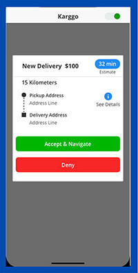 The Karggo Driver app will have a home screen that shows you your earnings, traveled locations, miles driven, time on the clock, and your account information. You will have analytics to use as a unit to measure days and profit as well.